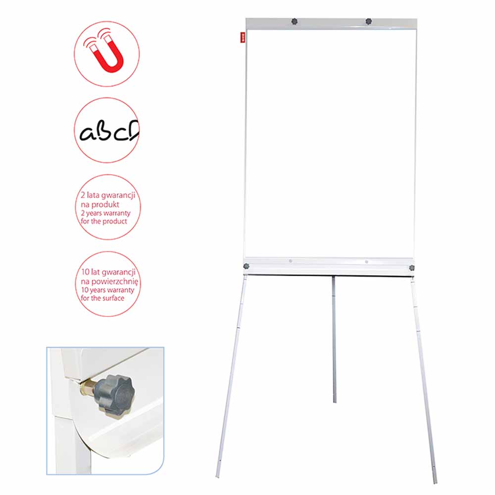 Stabilny trójnożny stojak, z możliwością regulacji wysokości do 186 cm, zapewnia komfort pracy na każdym poziomie. Niezależnie od Twoich preferencji, flipchart można łatwo dostosować do odpowiedniej wysokości, co czyni go idealnym wyborem do biur, sal konferencyjnych i szkół.