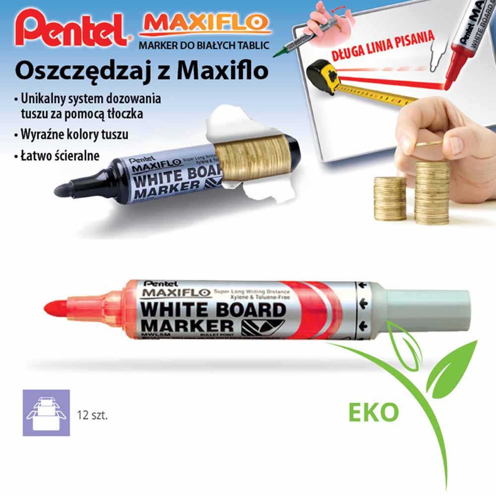 Marker do tablic suchościeralnych Pentel MW85 wyposażony jest w okrągłą końcówkę, która zapewnia precyzyjne i płynne pisanie. Idealny do prezentacji, notatek i rysunków na tablicach suchościeralnych.