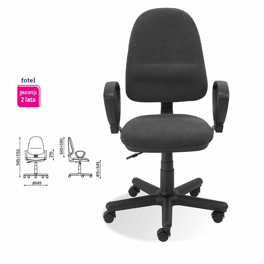 Czarna podstawa jezdna o średnicy 645 mm zapewnia solidność i trwałość, a kółka przeznaczone do powierzchni twardych umożliwiają swobodne przemieszczanie się. Regulowane podłokietniki zwiększają komfort pracy, umożliwiając wygodne ułożenie rąk.