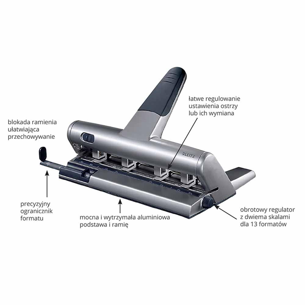 - blokada ramienia pozwala przechowywać dziurkacz z maksymalnie obniżonym ramieniem