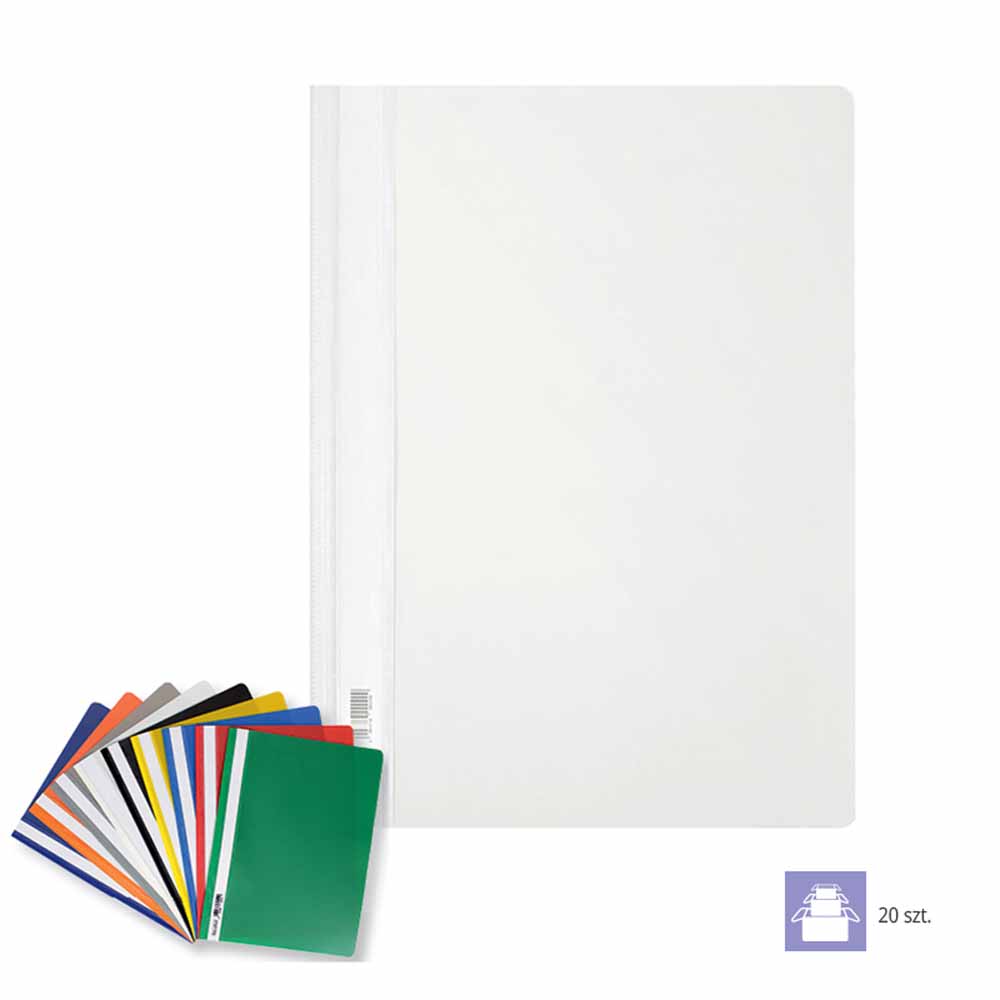 Skoroszyt wyposażony jest w wymienny, papierowy pasek do opisu, który ułatwia identyfikację zawartości. Dwa wycięcia umożliwiają szybkie i łatwe wysuwanie paska, co dodatkowo poprawia funkcjonalność. Zaokrąglone rogi obu okładek zwiększają komfort użytkowania i zapobiegają uszkodzeniom innych dokumentów.