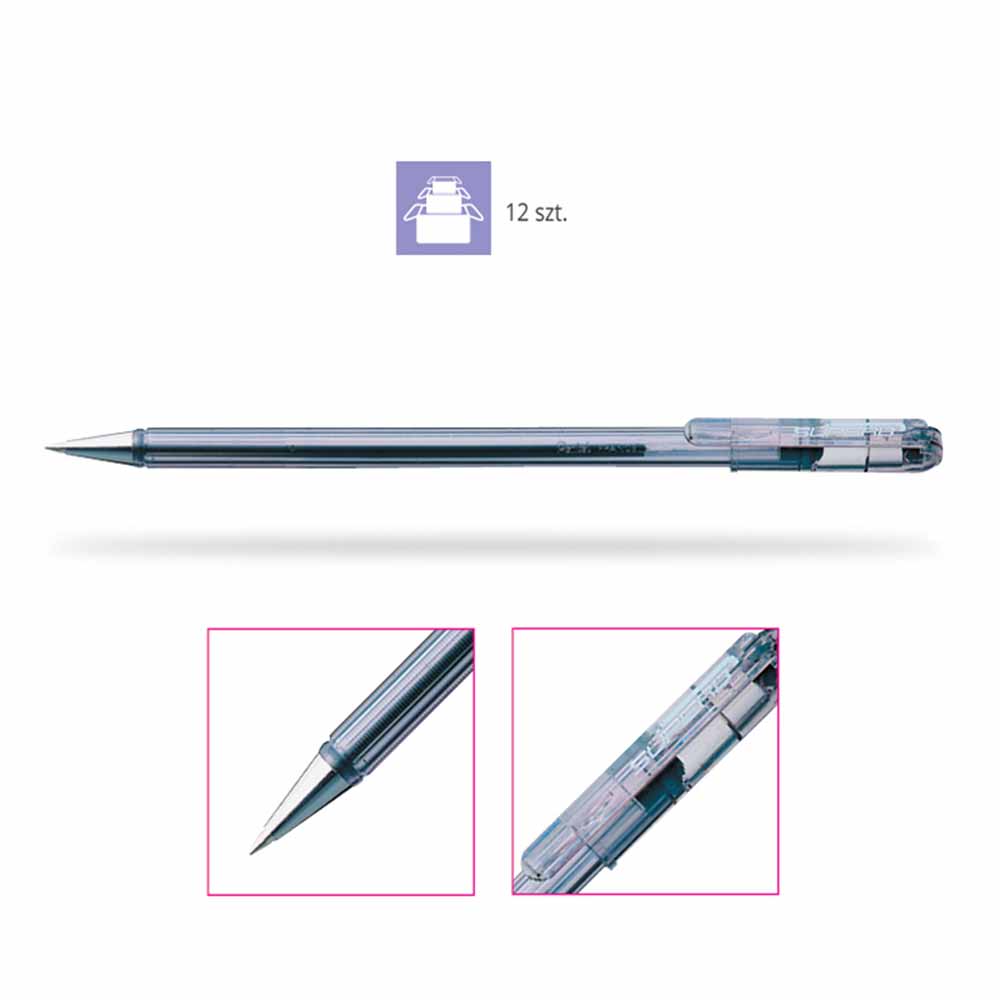 Długopis Pentel BK77 charakteryzuje się minimalistycznym designem z przezroczystą obudową, która umożliwia kontrolę poziomu tuszu. Ten klasyczny wygląd sprawia, że długopis jest stylowym i praktycznym narzędziem do codziennego użytku.